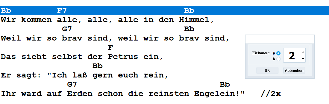Im Beispiel wurde der Song 2 Halbtöne hoch transponiert, der Ursprungsakkord Bb bleibt aber auf Bb.