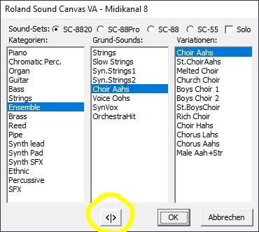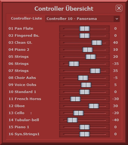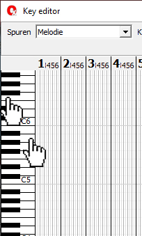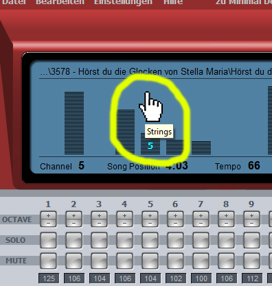 Beim Programmstart erscheint eine Fehlermeldung. Haben sie denn auch die aktuellste Programmversion? Klicken Sie im Programm auf "Hilfe - Nach Updates suchen" Alternativ auf unserer Webseite (www.midiland.de) unter Software die VOLLVersion herunterladen und installieren. RECHTS-Klick auf „Spur“ öffnet den Key-Editor: ![]() Mit gedrückt gehaltener „Strg“ (Ctrl) Taste und RECHTS-Klick auf einen der Mute Knöpfe kann die entsprechende Spur gelöscht werden: ![]() Klickt man im geöffneten Sounds Fenster auf „<|>“ springt der Song an die Stelle der ersten Note dieser Spur: ![]() Das gleicht Gilt auch wenn man einen Doppelklick über einer Spur im Display macht: ![]() Überfährt man im Key-Editor Fenster den Bereich der Velocity Einstellregler, dann kann man mit dem Scrollrad der Maus beide Einstellregler parallel nach oben und unten verschieben: ![]() Je weiter links man eine Taste im Key-Editor anklickt, desto leiser wird der Ton (Links= kleiner Velocity Wert, Rechts= großer Velocity Wert): ![]() Ein Klick auf „Controller“ öffnet die Übersicht ausgesuchter Controller ALLER Midikanäle: