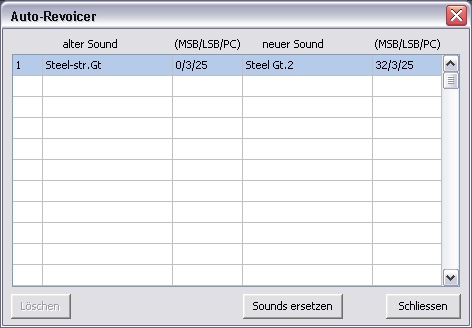 der Linken Seite und die gewünschte Soundvariation (Steel Gt.2) auf der Rechten Seite des Auto-Revoicers ein. Diesen Vorgang wiederholt man je nach belieben für jede Spur. Lädt man in Zukunft ein Standart GM- bzw. XG-File ein, startet den Auto-Revoicer und klickt auf Sounds ersetzen, dann werden automatisch alle Steel-Str.Gt, die der Auto-Revoicer im Midifile findet durch die Soundvariation Steel Gt.2 ersetzt. |