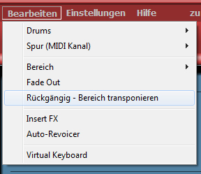 | Diese Funktion ermöglicht das Transponieren z.B. eines Refrains, einer Strophe, eines Gitarrensolos oder eines Intros u.s.w. Es ist auch möglich einzelne Bereiche, einzelner Spuren zu transponieren, auch wenn es Musikalisch keinen Sinn macht. Dazu wählt man den Bereich aus, der transponiert werden soll. Und so geht's: Von: 2 | 01 Das bedeutet; Startposition des zu transponierenden Bereiches ist Takt 2, Schlag 1. Bis: 10 | 01 Hier gibt man das Ende des zu transponierenden Bereiches an. Takt 10, Schlag 1. Mit den grünen Pfeiltasten transponiert man nun den ausgewählten Bereich um Halbtonschritte nach oben oder nach unten. |
