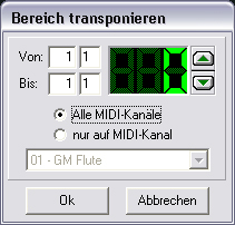 | Achtung! Es ist nicht unbedingt gewährleistet, dass sich nach Ausführen der Funktion "Bereich transponieren" die Übergänge "musikalisch" passen. Normalerweise ist es zwingend erforderlich, um in eine andere Tonart zu modulieren, einen musikalisch entsprechenden Übergang zu programmieren. Die Funktion "Bereich transponieren" transponiert zwar den ausgewählten Bereich, aber ohne einen übergang zur neuen Tonart bereit zu stellen. |