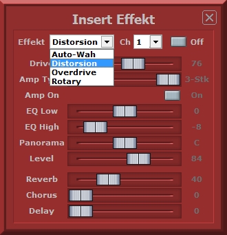 Hiermit kann man einem Midikanal mit "Auto-Wah", "Distortion", "Overdrive", "Rotary" oder "Stereo EQ" Effekt belegen.