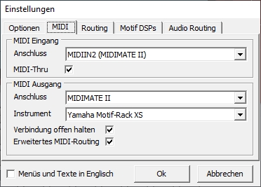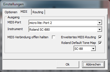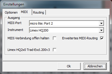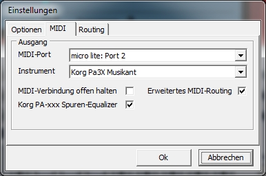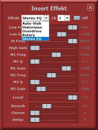 | MIDI-Eingang: Hier können Sie den gewünschten Midieingang auswählen. Dieser dient zur Record Funktion (Aufnahme). Ausführliche Informationen finden Sie unter Record Funktion MIDI-Thru angehakt bewirkt, dass beim Spielen der am Midi Eingang angeschlossenen Tastatur der Ton der Ausgewählten Spur in Echtzeit am Midi-Ausgang angeschlossenen Gerät zu hören ist. MIDI-Ausgang: Hier können Sie den gewünschten Midiausgang auswählen. Und hier wird via Midi das Instrumnent angeschlossen. Instrument: Mit „Instrument“ wählen Sie das Soundmodul bzw. Keyboard aus, welches zum Abspielen am entsprechenden MIDI-Ausgang angeschlossen ist. Jedem benutzten MIDI-Ausgang kann ein beliebiges Instrument zugewiesen werden. „Sounds-Reset unterbinden“ Diese Funktion benötigen Sie, wenn den Synthesizer der Soundkarte oder einen Software-Synthesizer benutzen. Ist diese Funktion nicht aktiviert, kann es vorkommen, dass Sie nach dem Vor-spulen oder bei erneutem Abspielen nach einem „Stop“ nur noch „Piano“ Stimmen hören. Zur Auswahl stehen Ihnen der direkt Zugriff auf die Sounds von: GM: Soundset (Zugriff auf 128 Standard GM Sounds) GM2: Soundset (Zugriff auf 256 Standard GM2 Sounds) GEM: Genesyspro, GenesysproS/XP, GM-X HDS: Pro.Sound.1 Ketron: Audya, Audya4, Audya5, Midjay, MidjayPLUS / PRO, SD1, SD1plus, SD2, SD3, SD4, SD5, SD7, SD9, SD40, SD1000, X1, XD3, XD9 Korg: i30, MP10 pro*, Pa1Xpro, Pa1Xpro XMS-1 V3, Pa2Xpro*, Pa3X Musikant*, Pa4X Musikant* Pa-60/80, Pa500 Musikant*, Pa700*, Pa800*, PA900 Musikant*,PA1000 Musikant*, Kronos (2015),Pa3X Musikant Update Version 1.5 * Hinweis: Bei diesen Instrumenten steht die Verwqaltung des Spuren EQ zur Verfügung ![]() Limex: ALPINMASTER16, ALPINMASTER32, ALPINMASTER 128, Limex Doppelpack 256, Limex G4, Limex G4 Plus, Limex G5, Limex HQ200 (HQ2x0 Trad-Excl.200v3)*, Limex HQ260, Limex Tradition Exclusiv, Limex Tradition Exclusiv 200v3, Limex Quattropack *Hinweis: Ist das Instrument Limex HQ200 ausgewählt lässt sich die Option HQ2x0 Trad-Excl.200v3 zuschalten: ![]() Miditemp: DoX-1, MP11 Roland: BK-9, DisCover5, fantomXR, G-70(SR-G01), Integra-7, Juno-Stage, SC-88*, SC-88Pro*, SC-880*, SC-8820*, SC-8850*, SC-D70* SD-50, SonicCell, VIMA JM-8, Soundcanvas VA (VSTi), * Hinweis: Bei der Roland SC-Serie kann eine Default Tone Map aktiviert werden. Diese gibt vor, in welcher Tone Map man bevorzugt arbeiten möchte: ![]() "Default Tone Map" (betrifft nur Roland-Soundmodule der Serie Sound Canvas) Hier wird vorgegeben, ob die SC-55, SC-88, SC-880 Instrumente als Standard Map verwendet werden sollen. warum das? Falls im Midifile kein Controller 32 vorgegeben ist oder Controller 32 Wert 0 (Native Map) ausgewählt ist, kann hier auf Wunsch eine Voreinstellung gemacht werden. Beispiel: Wir haben ein Roland Soundmodul SC-880. In diesem Soundmodul sind in Wirklichkeit zusätzlich noch 2 Soundmodule der früheren Entwiklungsstufe mit allen Klangfarben und Variationen enthalten. Nämlich der Soundcanvas SC-55 und der Soundcanvas SC-88. Man spricht hierbei aber nicht von Soundcanvas SC-55 oder Soundcanvas SC-88 oder Soundcanvas SC-880, sondern man spricht von Instrumenten Maps. Die einzelnen Maps kann man im Midifile mit Controllern direkt ansteuern,d.H. man hat die Möglichkeit auf alle Klangfarben, inklusieve Variationen aller drei geräte zuzugreifen. Soundcanvas SC-55 = Controller 32 Wert 1 (Insrtumenten Map 1) Soundcanvas SC-88 = Controller 32 Wert 2 (Instrumenten Map 2) Soundcanvas SC880 = Controller 32 Wert 3 (Instrumenten Map 3) Um wirklich auf alle drei Instrumentenmaps zugreifen zu können, muß an der Hardware (am SC-880) die höchste Instrumenten Map eingestellt sein. Steht der SC-880 auf der SC-55 Map, kann man nicht mit dem Midifile auf die SC-88 Map zugreifen! Für diverse Roland Geräte steht zudem noch ein Insert-FX DSP für einen Midikanal zur Verfügung. Zu diesem gelangt man über Menü Bearbeiten - Insert FX: ![]() Soli: GM ALPHA, TraditionXL Solton SG-X Technics: KN6000 V3 Sound: MM-Edition, MPR5+, Musik Herzing, Sonotory, Sonotory XXL, TR521 YAMAHA: Genos*, Motif XF*, Motif-Rack ES*, Motif-Rack XS*, MU90 (oder kompatibel), PSR-3000,PSR-8000,PSR-9000, 9000Pro, PSR-S900*, PSR-S910*, S950*, S970*, S90, S90 ES, Tyros*, Tyros2*, Tyros3*, Tyros4*, Tyros5* Besondere Pakete: Tyros 3 Packs: Premium Voices Tyros 4 Packs: Premium Entertainmer, Türkisch, Latin, Vintage Synth, Country Musician Premium, Premium Celtic Tyros 5 Packs: Premium Alpen, HDS.Sound.Power, Best of Europe, Choir & Vocals, Entertainer, Euro&US Organs, Euro Dance, Vintage Synth&Keys, Latin Pack, SA2 Voices, Country Musician Premium, Premium Celtic, V3 Stars der Volksmusik, V3Sound: TR521 (T4 & T5 Vocal Harmony Unterstützung) * Hinweis: Diese Instrumente sind mit kompletter Part-EQ und DSP-Verwaltung XG: Soundset (Zugriff auf 615 Standard XG Sounds) |