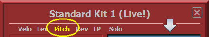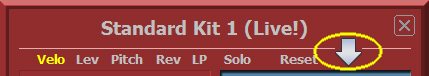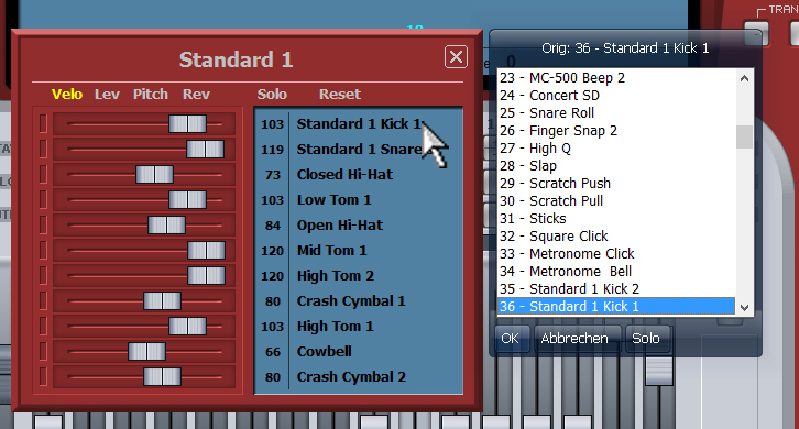 Doppel Klickt man mit der linken Maustaste auf den Name des Schlagzeugsets, so gelangt man direkt in das Sounds Fenster und kann ein anderes Drumkit einstellen. |