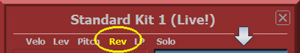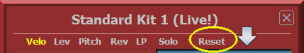 Mit Doppelklick auf „Reset“ werden die Ursprungswerte der Volume Einstellungen sowie die geänderten Sounds des Schlagzeugs wiederhergestellt. Lev, Pitch, Rev und LP werden nicht zurückgesetzt. |