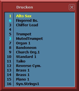 | Dazu im Menü auf "Sounds" klicken. Es öffnet sich das Sounds Fenster. Hier erhält man einen Überblick, welche Instrumente im Midifile benutzt werden. In "grau" dargestellt sind die Sounds. In "hellblau" dargestellt wird der gerade aktive Kanal. (der Kanal, welcher zum Editieren "aktiv" ist) Die in "rot" dargestellten Zahlen zeigen die Midikanäle an, welche getauscht wurden. Mit Doppelklick auf den Soundnamen einer Spur öffnet sich das Sound-Sets Fenster. Mit Klick auf "x" schließt man das "Sounds" Fenster. Mit Klick auf Drucken wird ein Spurenplan erstellt. |