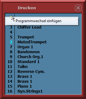 | "Sound einfügen" (Program change einfügen): Ertönt in einer Spur nur "Piano" und lässt sich das Instrument nicht verändern, so ist dass ein Zeichen dafür, dass der "Program change" in dieser Spur fehlt. Diesen fügt man wie folgt ein: - Mit der rechten Maustaste auf das leere Feld neben der Zahl der entsprechenden Spur klicken. - "Programmwechsel einfügen" bestätigen - Es erscheint Piano 1. Mit Doppelklick kann man nun das gewünschte Instrument einstellen. |