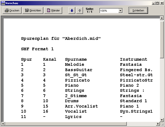 | Drucken (Spurenplan ausdrucken): Hier kann der Spurenplan des geladenen Songs ausgedruckt werden. Dazu im "Sounds" Fenster auf "Drucken" klicken. Jetzt öffnet sich die Druckvorschau, in der alle erforderlichen Einstellungen zum Druckvorgang vorgenommen werden können. |