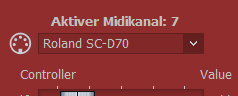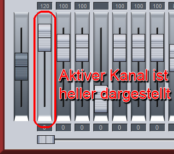 | Der Untergrund des Volume Reglers wird beim gerade aktive Kanal heller dargestellt. Auch in "gelb" zu sehen im "Sounds" Fenster. Ebenso wird der aktive Kanal im Display und über den Controllern angezeigt (Midi-Kanal ist gelb und in der Channel Anzeige). Der aktive Kanal wird automatisch selektiert, sobald man die Tasten Solo, Mute, Manual Transpose "+" oder "-", Volume eines Kanals betätigt. |