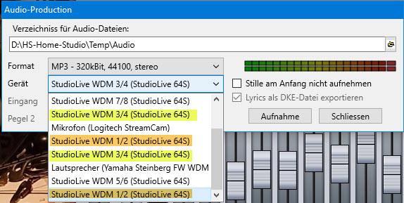Ich kann auf beiden Eingängen Aufzeichen. Default ist der Studio Live 64S: StudioLive WDM 1/2" in Windows belegt.